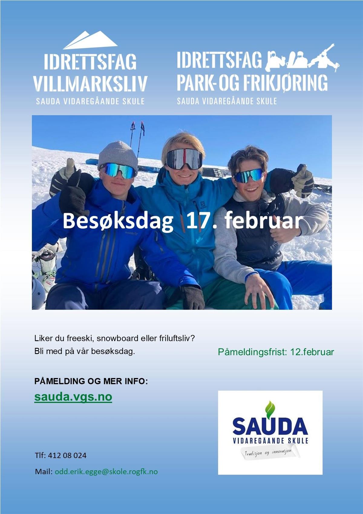 Me møtest på Sauda VGS for ei omvisning og generell informasjon. Deretter reiser Park- og frikøyring opp til Skisenteret for ei økt på ski/brett, og Villmarksliv til Lyngmyr for aktiviteter ute.